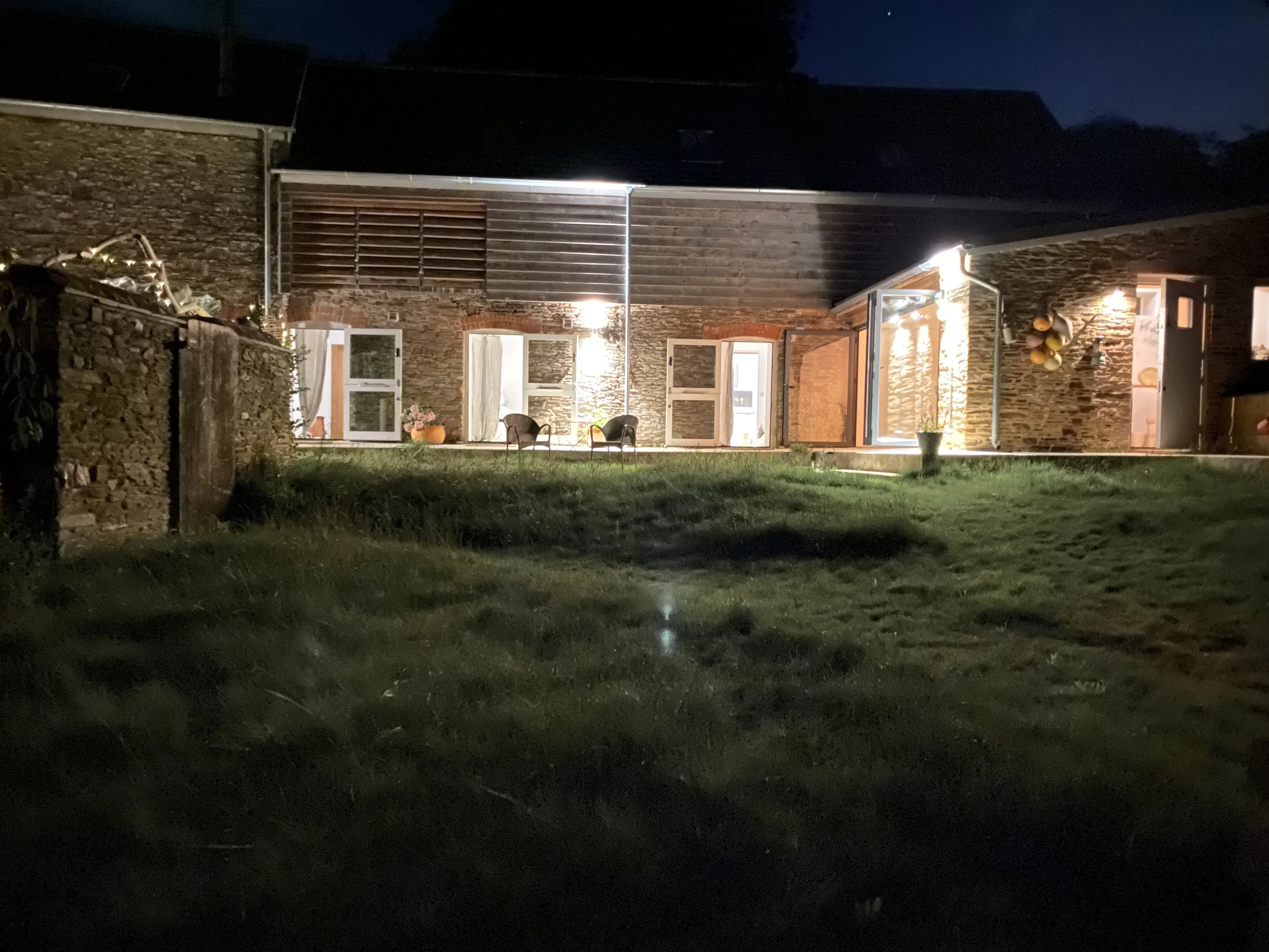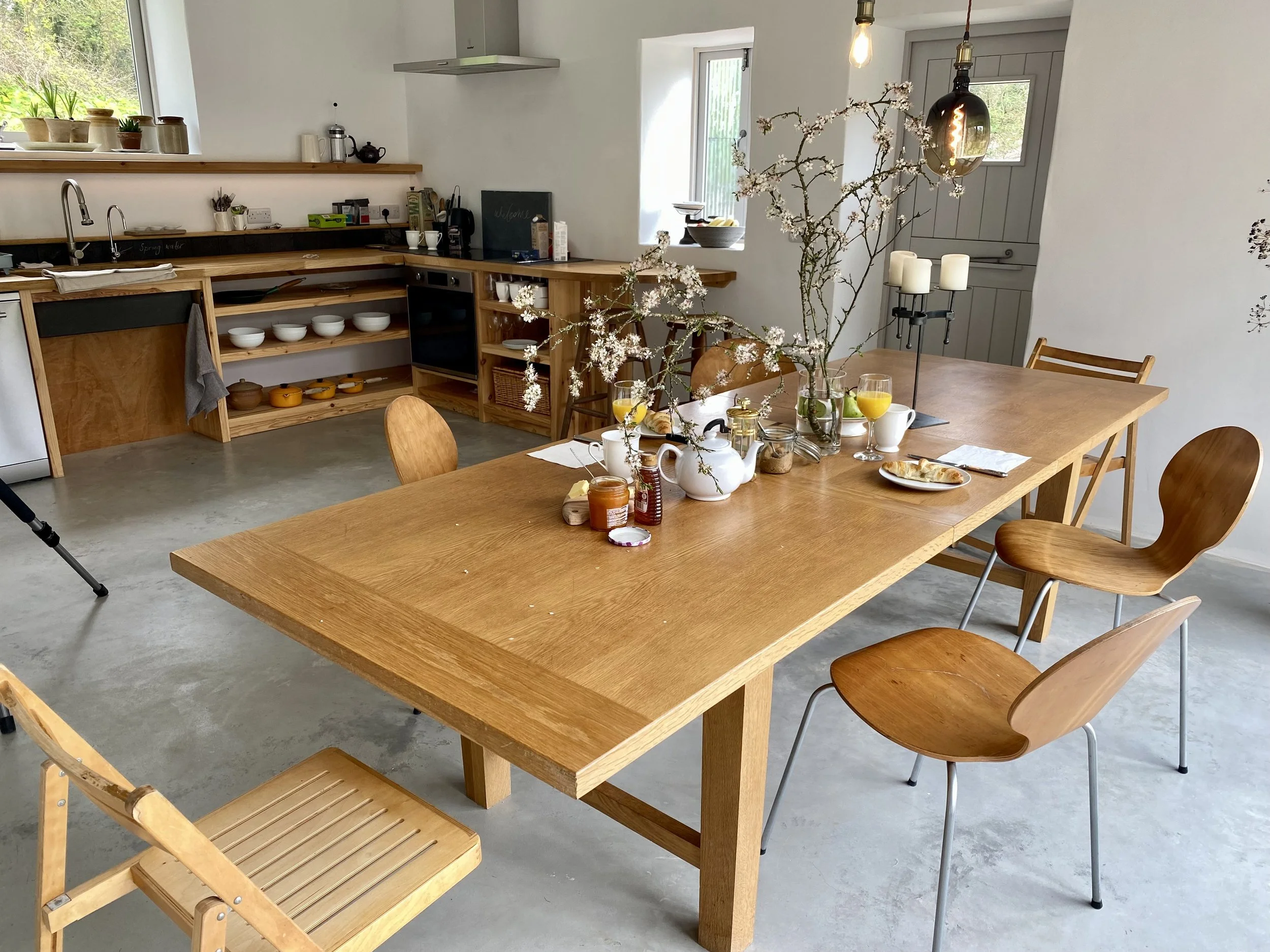 Wake in the morning to the singing of the birds and stream. The smell of fresh coffee and baked croissants. Eat in the kitchen at the large communal dining table or outside in the garden or orchard. Glass folding doors open onto the garden. Lunch and supper at the many local eateries, the closest being Ben Howard's 'Outside' about two minute’s drive away or walk up to the village pub.